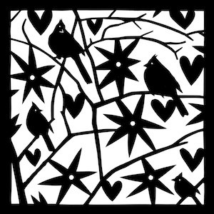 The cuttings for this exhibition are all of birds. I live in the country and am lucky to have many types of birds close to my home. The cuttings are all in black and white. Please use your imagination to see the beautiful colors of the birds.