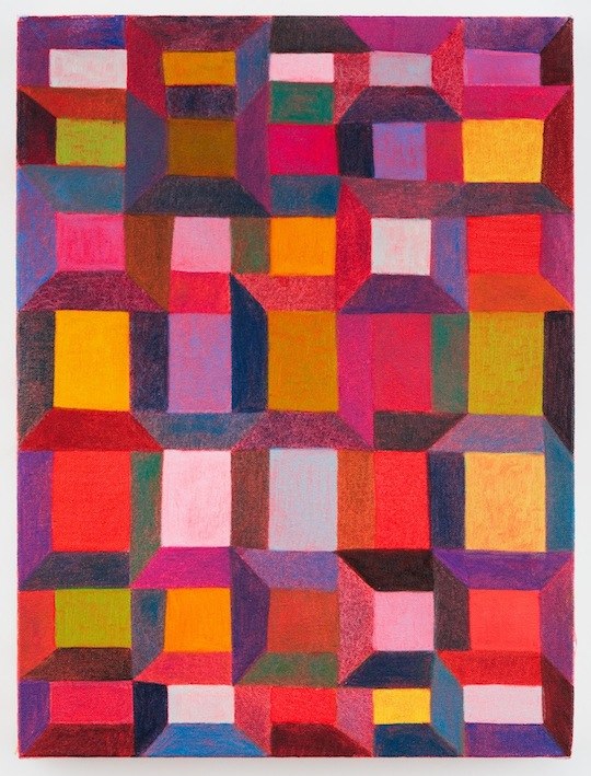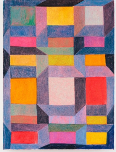 Christopher Dunlap’s paintings engage the viewer through a playful, disruptive exploration of color and pattern. These forms create a multiplicity of relationships between simple shapes and complex structures. Through specific placement, repetition, and implied perspective, the paintings assert a sense of depth. By creating an image that can register spatially in multiple ways, the paintings draw the viewer to a heightened awareness of their own visual processes. This sustained attention seeks to bridge a gap between perception and sensation.