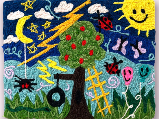 Image on TOP: Tire Swing, embroidery, 11x14 in.