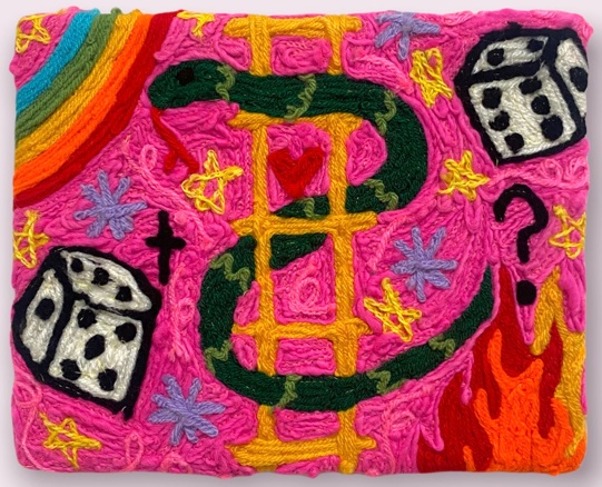My work contains a lot of symbolism. These embroideries are often extremely playful but packed full of metaphors and storytelling. Snakes and ladders is a game that involves luck and chance. To roll and land on a ladder, pushes you forward. To roll and land on a snake, pulls you backward. I use these symbols often in my work. Both represent the uncertainty and gamble of what’s to come.