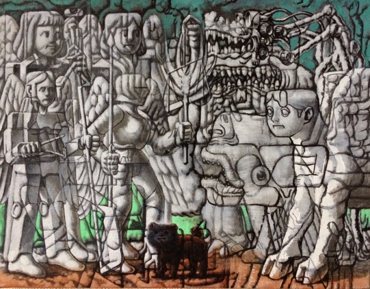 I make paintings of my imaginary game scenes based on the inspiration of video games from my childhood. Nowadays, it’s called retro games. To transform these paintings into works of art, I’m injecting my knowledge into the work. What I have been thinking recently is that if you follow your instinct, this is the pattern, “Be-afraid, then Become-aggressive, and finally, Knock-opponent-down.” This pattern also becomes amusements. This rule can also be adapted to video games and I enjoy that as well. My paintings reflect this theory. However, if you show aggression in the real world, it can be pretty much a big problem. In the actual world of today, I tell myself, “Don’t be afraid.” This is the title for this exhibition.