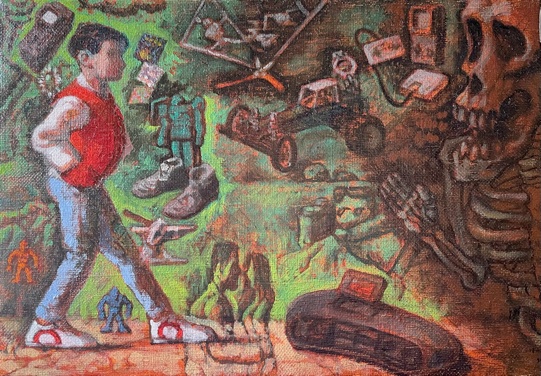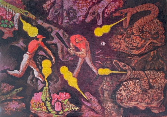 Below: To not to fight, Leader, Hobby, Falsehood, 22.7x15.8cm, oil on canvas, 2023