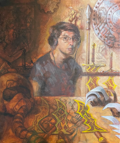 Image on TOP: Self portrait as a weapon’s dealer, 45.5x38cm, oil on canvas, 2023