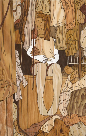 このプロジェクトで彼女は、さまざま種類の木でつくられた寄せ木、象眼細工のイメージを得るために木製パネルに描き、木目や節穴もアクリル絵画で再現しています。
