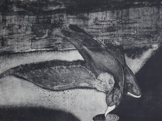 トップ:「鳥と魚」49.2x66.1cm、銅版画(インタリオ)、2022年