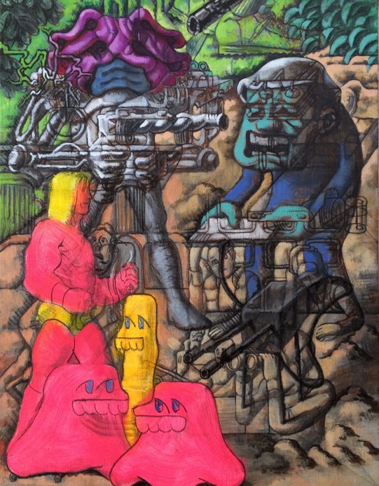 最近考えている事は、以下の事です。「怖がる→攻撃的になる→敵を倒す」本能に従うと、このパターンになり、これは娯楽にもなります。ビデオゲームにもそれは感じられ、それを楽しんでいる自分もいます。自分の描く絵にもこの原理は入っています。しかし、現実生活で攻撃性をちらつかせると問題があります。最近の現実生活では、まずは怖がらない事を自分に言い聞かせています。そんな訳で、今回の展覧会タイトルを「Don't be afraid」としました。