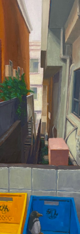 境目の空間はほとんどの街や都市で見つけることができる。それらは建築物の移行の空間であり、多くの場合、見落とされているが、どんな家、オフィス、もしくはショッピングセンターの実用性に必要なのである。街を歩いて、二つの建物の隙間を覗く。それはいつも放っておかれて人間の存在もない、数少ない場所である。無作為な残がい、どこにでもあるエアコンと草木の葉で埋め尽くされて、一貫した美学を持っている(そう呼ぶことができるのであれば!)、でもやはり、この偶然の美の中に、いつものように見落とさずに評価する魅力がある。光、空気、緑樹、そしてリサイクル回収箱を置くスペースまで、それらが備える美を重んじる。
