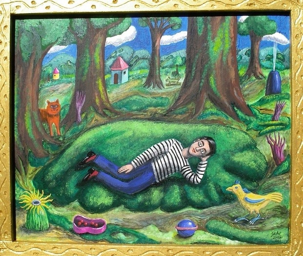 Lower middle: A man relaxing, acrylic on wood, 2015