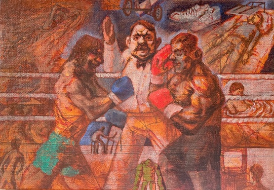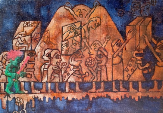 Below: To not to fight, Leader, Hobby, Falsehood, 22.7x15.8cm, oil on canvas, 2023