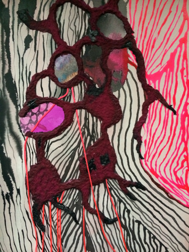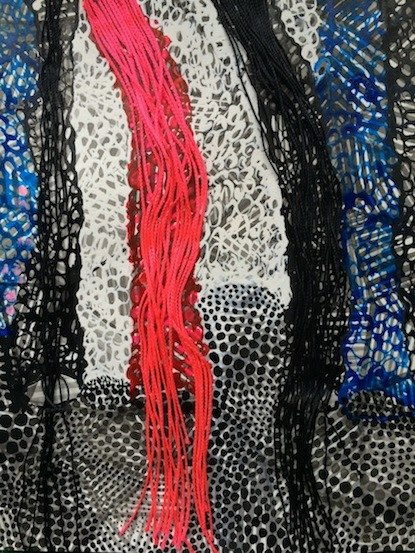 上:「Fiber」紙にカラーインク、墨、ひも、2015年