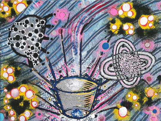 私の最新の作品は、10年間をアジア(ほとんどがタイでの生活)で過した後、昨年2月にアメリカに戻ってから考えている多くの事柄に関している。この国に戻ってから自分の人生に、予測していなかった多少の不安を感じた。そしてそれは、作品に表れているように私には思える。スペース(宇宙)をモチーフにした作品では、中心から少し外れ、コンポジションは、より落ち着きがなく抽象的に見える。私が制作しているよりも誰か、または何かが私も通してチャネリングしているようにも思える。私は、いつもこの想いがあったが、それは以前よりも強くなった。故郷に戻るということは、何らかの作品の概念的性質が取り去られ、いっそうエモーショナルな所から来るのではないかと思う。